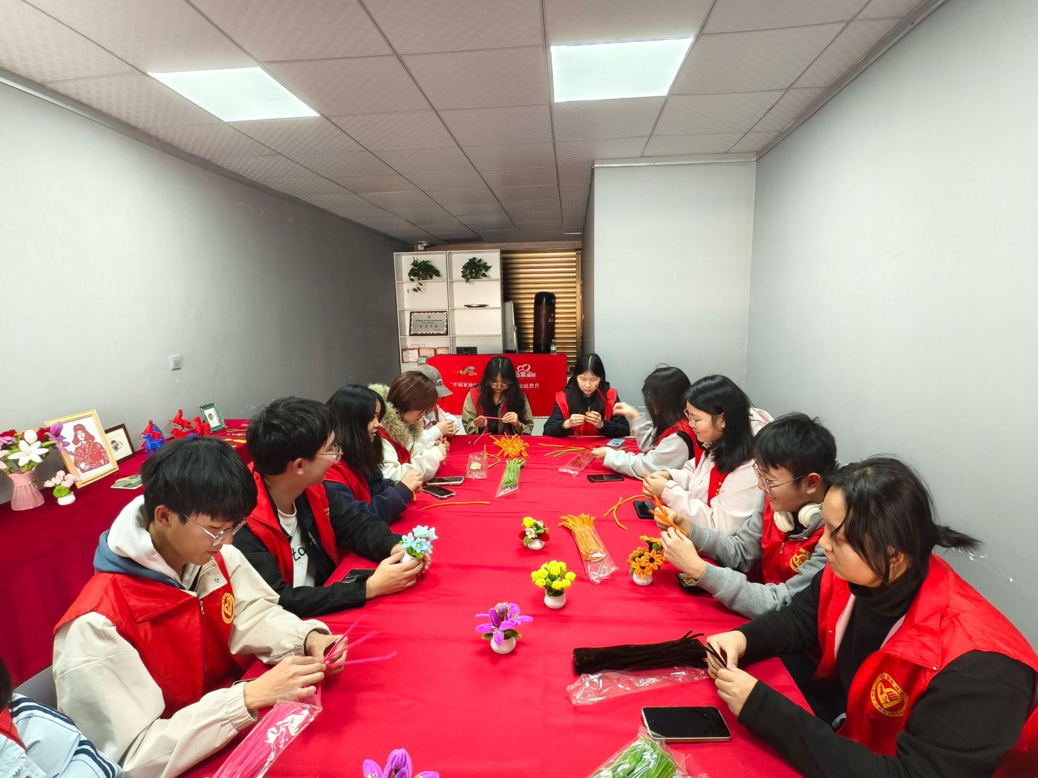 活动伊始,志愿者们有序集合,统一领取志愿服装,在阳光雷锋志愿服务队工作人员的指导下,明确岗位职责与服务流程。志愿者们提前熟悉活动场地,检查活动所需物资,根据服务内容划分工作小组,细化分工安排。活动期间,志愿者按照既定方案开展服务:在手工制作环节,协助儿童使用扭扭棒完成花朵制作,指导完成造型、配色等操作,带领其体验手工的乐趣;在场地布置环节,根据活动安排完成气球悬挂、彩带装饰及桌椅摆放等工作,增加活动现场的趣味气氛;在环境维护环节,定时对活动区域进行清扫,及时清理杂物、擦拭公共设施,维持场地整洁有序。志愿者全程陪同儿童参与活动,回应相关需求,配合完成各环节流程。