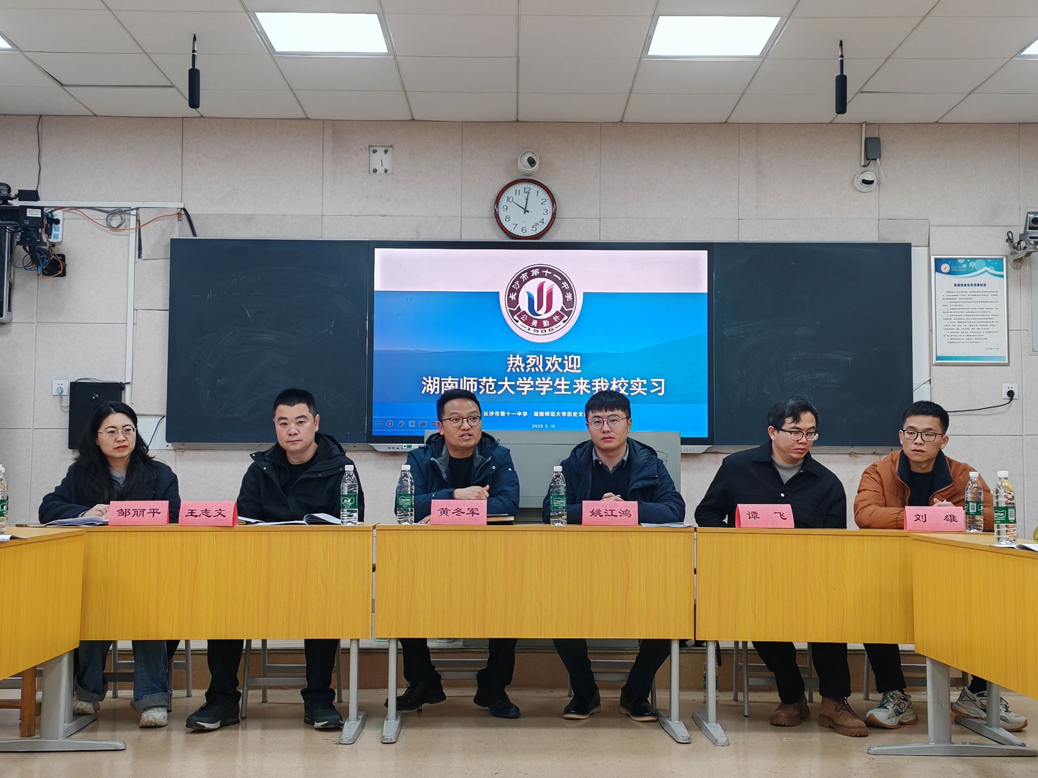 3月16日上午,湖南师范大学历史文化学院长沙市第十一中学实习队全体队员与指导老师姚江鸿抵达实习学校,在实习学校会议室召开实习工作见面会。此次会议由长沙市第十一中学历史教研组长邹丽平老师主持,副校长黄冬军、教务办主任王志文及相关科室老师,与实习队全体成员参与本次会议。