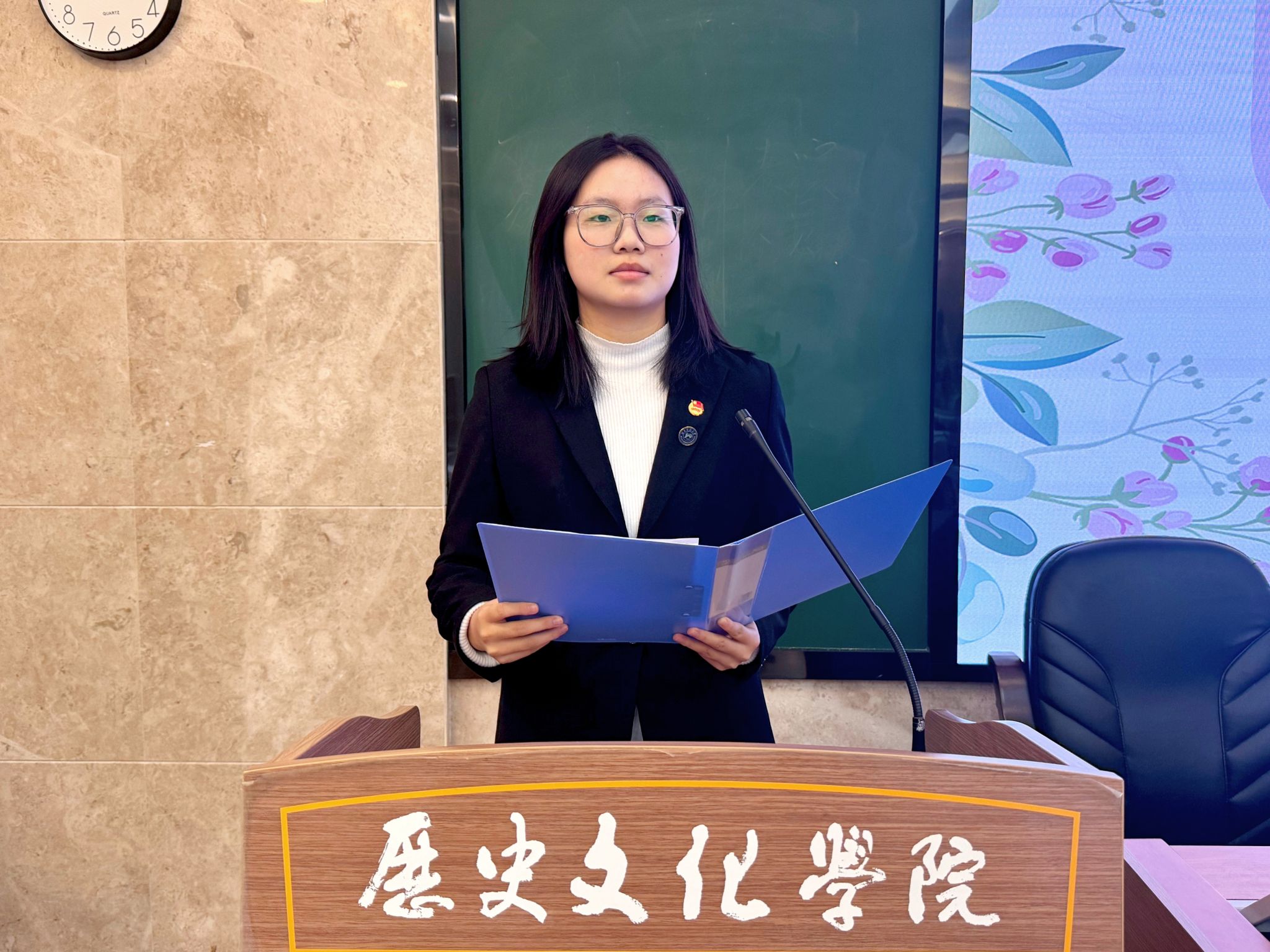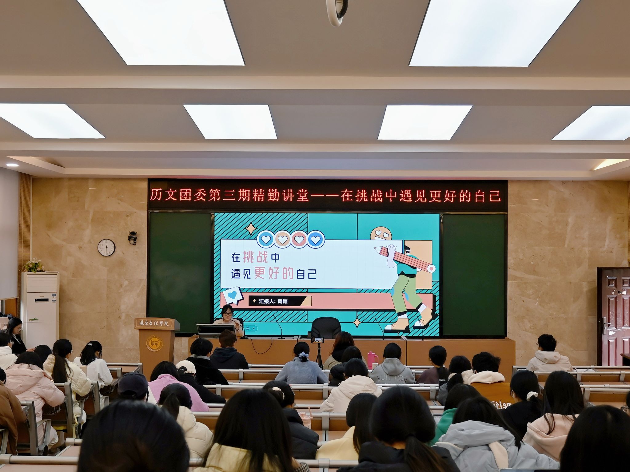 (通讯员 刘念 李采宸)12月4日中午,历史文化学院团委青创部在历文院203学术报告厅举办第三期精勤讲堂“在挑战中遇见更好的自己”。此次活动由2023级周颖同学主讲,青创小组全体成员参加。