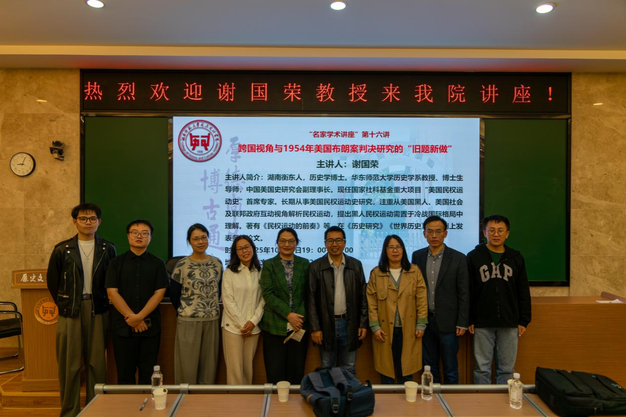 (通讯员李嘉鼎邓洁)2025年10月24日晚,湖南师范大学历史文化学院“名家学术讲座”第十六讲在文渊楼203报告厅如期举行。华东师范大学历史学系教授、中国美国史研究会副理事长谢国荣担任主讲嘉宾,以“跨国视角与1954年美国布朗案判决研究的‘旧题新做’”为题,为在场师生带来一场兼具历史深度与学术前瞻的精彩讲座。