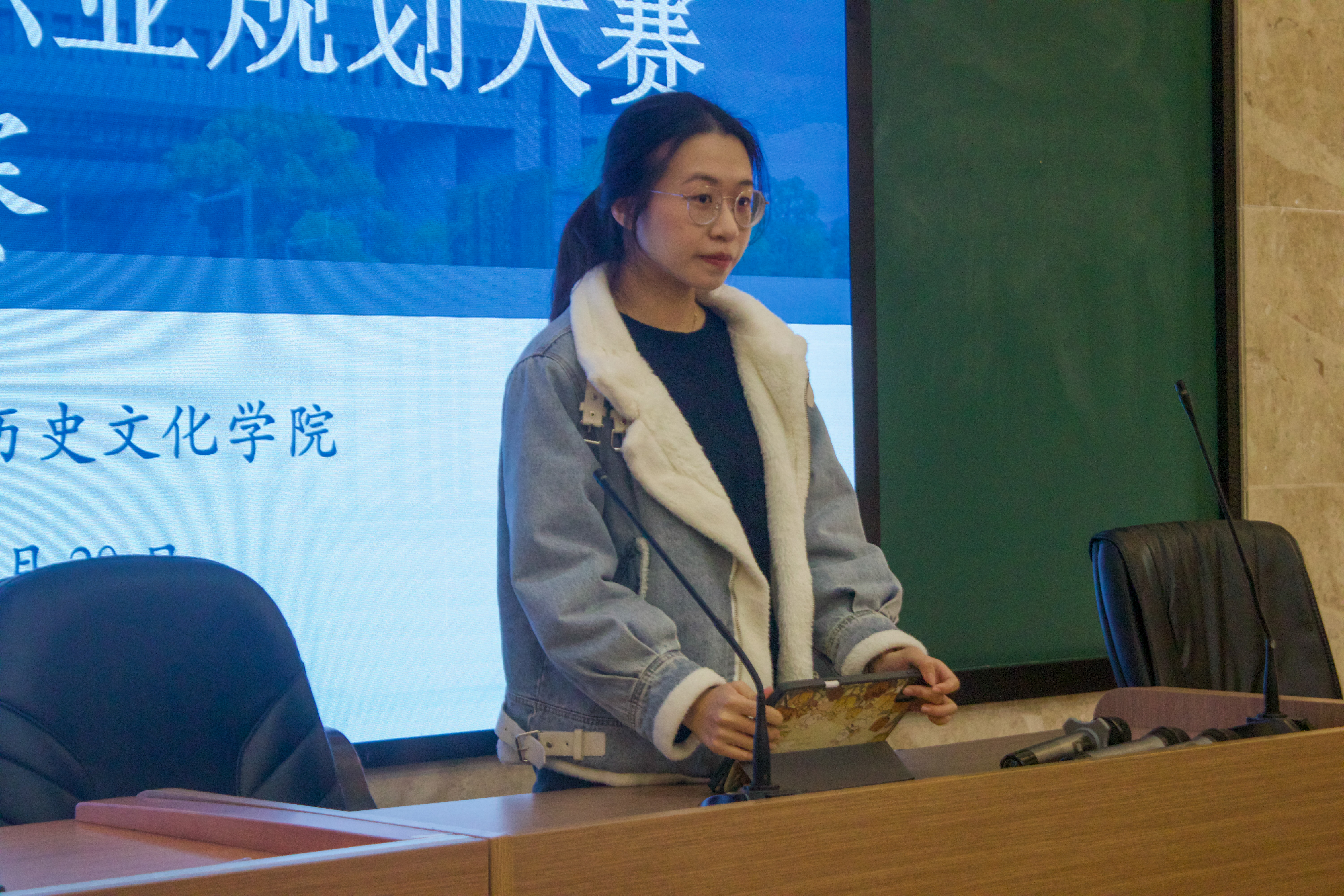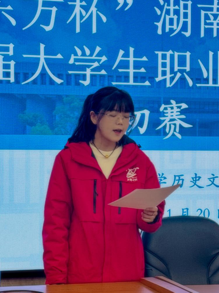 经过前期动员,共有7名同学提交参赛材料,其中3名选手进入现场展示环节。历史文化学院兰岚老师、晏湛老师担任评委,依据大赛评分标准,从内容完整性、职业匹配度、表达感染力等多维度进行综合评定。最终,2024级中国近现代史专业硕士研究生杨卉同学脱颖而出,将代表学院参加校级复赛。