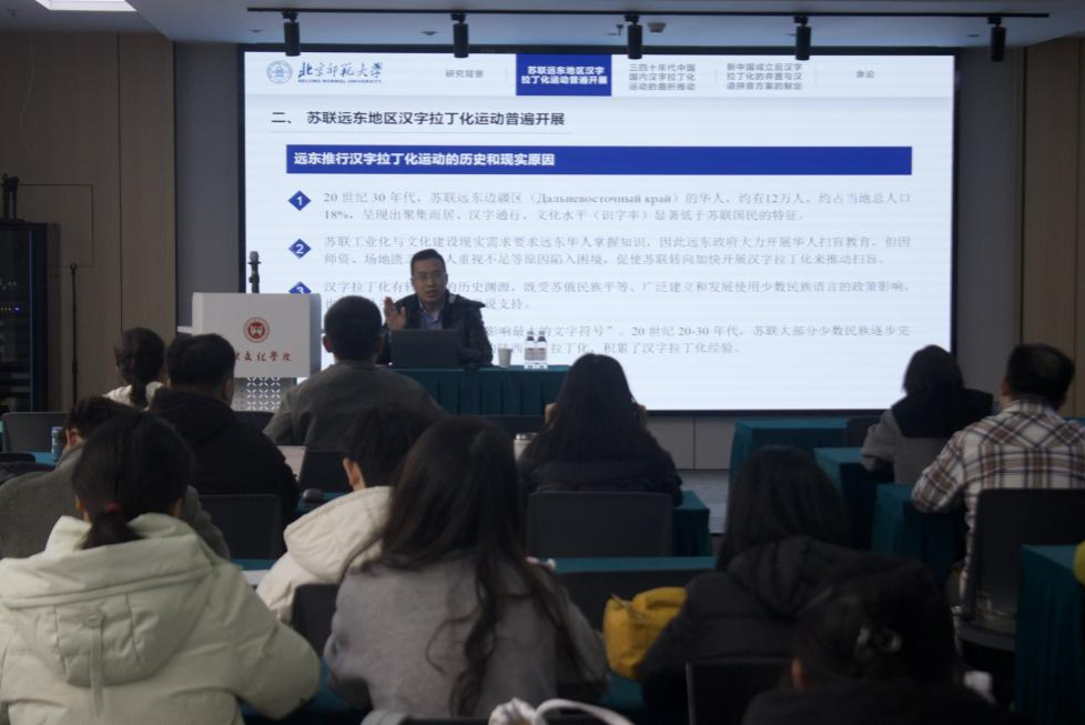 讲座伊始,孙会修教授从汉字拉丁化运动的研究背景切入,简明阐释了这一运动的核心概念,将其定位为近代文字改革运动的重要组成部分。他提到,目前学界对这一运动的研究仍有拓展空间,随后围绕苏联远东地区的汉字拉丁化实践展开讲解。孙教授介绍,苏联远东地区曾因当地华人文化水平偏低、工业化与文化建设需求迫切,因此要推动了汉字拉丁化运动。这一运动通过出版科普读物、开设相关课程、举办补习班等方式推进,成为汉字拉丁化的首次大规模实践,还对东方国家的文字改革产生了影响。