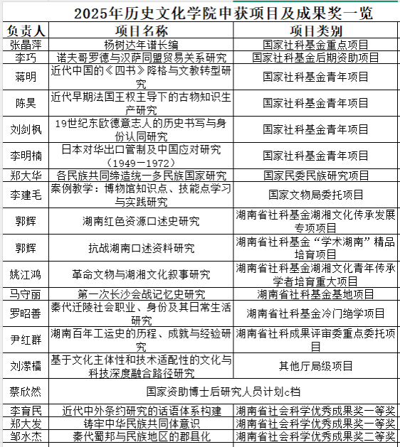 2025年我院科研工作再获佳绩,共获批6项国家社科基金项目,其中重点项目1项、后期资助项目1项,青年项目4项,立项数量与质量均位居学校前列。同时,我院还获批国家资助博士后研究人员计划C档1项;国家文物局委托项目1项;国家民委民族研究项目1项;湖南省社科基金项目5项(湖湘文化传承发展专项1项、“学术湖南”精品培育项目1项、湖湘文化青年传承学者培育重大项目1项、基地项目1项、冷门绝学项目1项);湖南省社科成果评审委重点项目1项;其他厅局级项目1项。同时,本年度学院科研成果获湖南省第十六届社会科学优秀成果奖一等奖2项、二等奖1项。