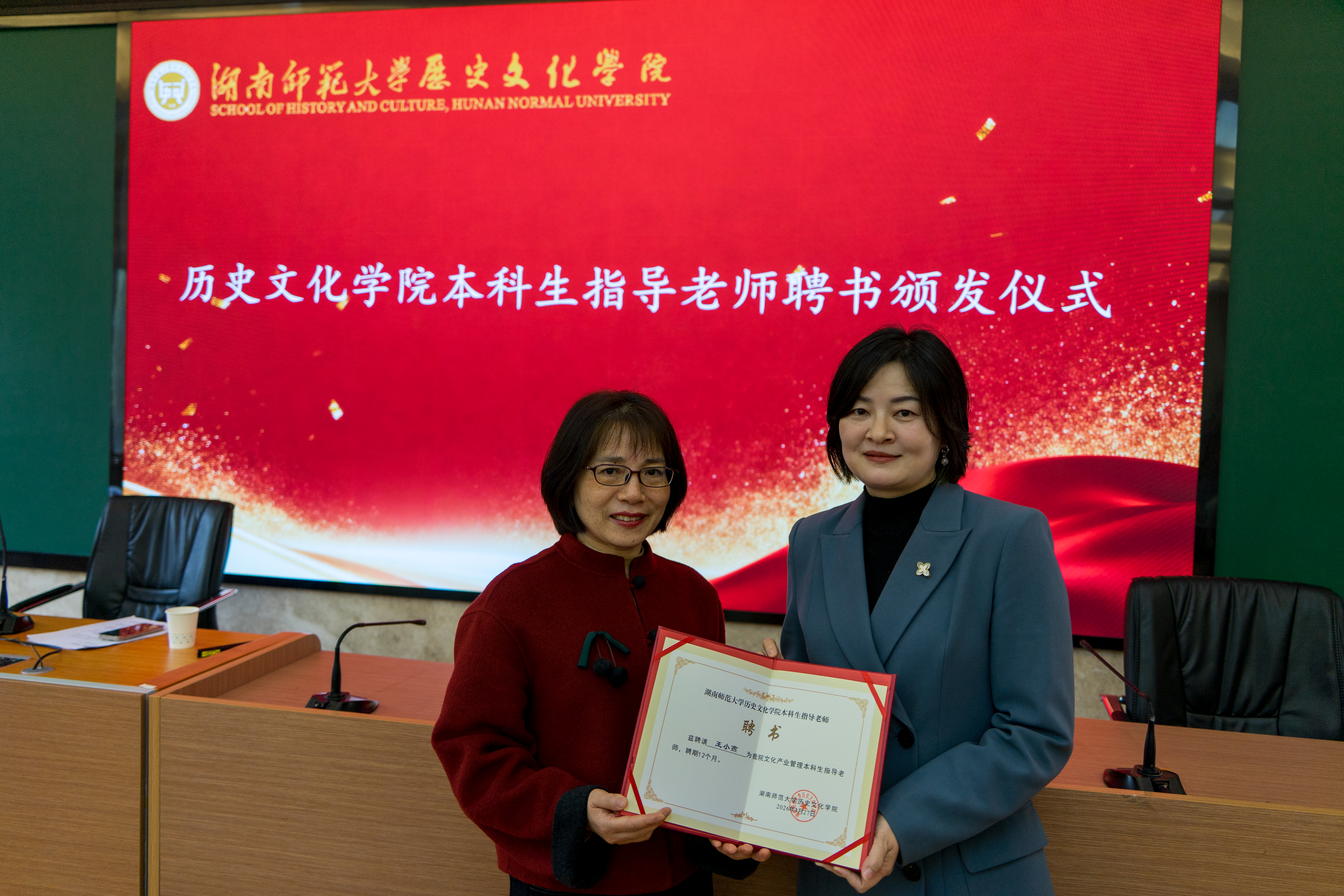 讲座结束后,傅新球副院长为王小燕颁发“历史文化学院本科生指导老师”聘书,标志着校企双方在合作育人方面迈出了坚实而有力的一步。随后,双方就人才培养与实习就业议题展开座谈。王小燕表示,公司目前开放研学导师、课程设计、新媒体运营等岗位,诚邀有志于研学行业的同学前来实习就业,共同探索“万事万物皆可研学”的行业新生态。