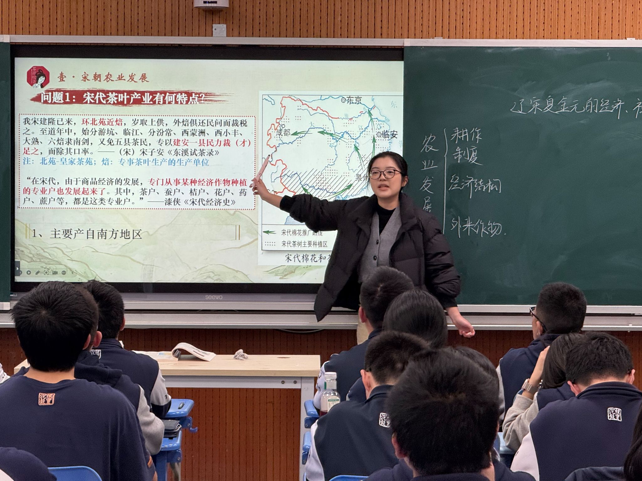 公开课由实习队员、历史文化学院2022级实习队总队长姚丁方执教,授课内容为《辽宋夏金元的经济与社会》,以“回到大宋开奶茶店”为情境线索,巧妙地串联起辽宋夏金元时期的经济、社会状况等知识脉络。指导老师充分肯定这堂公开课风格生动活泼,整体设计感强,史料丰富,讲授维度多元化,紧扣教学的重难点,师生互动紧密,充分展现了授课老师的素养。老师们也对教学有待优化之处进行了探讨。评课结束后,实习队队长陈琳琳汇报了实习队的工作成果。