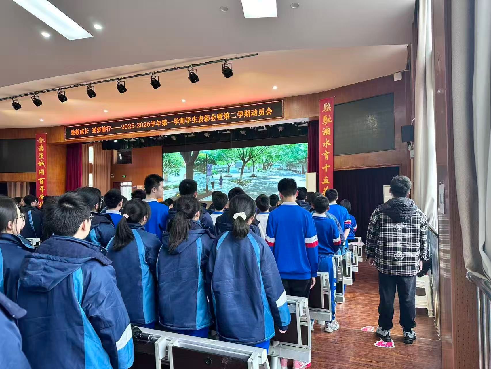 为协助学校做好学情总结与学生激励,实习队员全程参与长沙市雅礼十五中“2025-2026学年第一学期学生表彰会暨第二学期动员会”的现场保障工作。大会前,实习队员有序组织学生入场、引导就座并核对入座情况;会议过程中,实习队员们承担幕后颁奖流程衔接、荣誉证书分发工作,同时值守会场维护纪律,为大会高效、有序开展提供保障。此次实践不仅锻炼了实习队员的组织协调能力,也深化了对教育工作者责任与使命的理解。