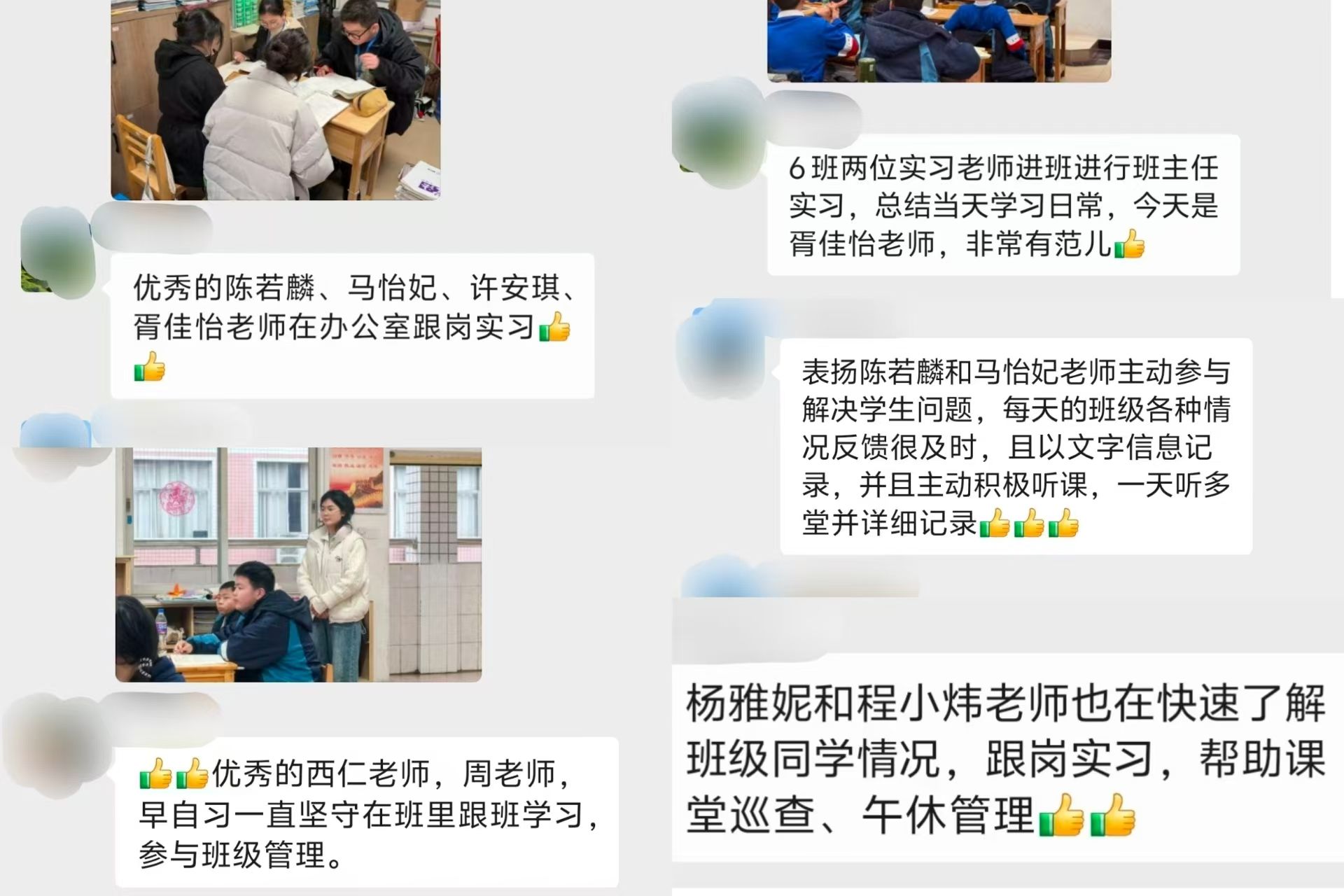 在班级管理实践中,实习队员全面融入学生日常校园生活,全程跟进早读、眼保健操和室内课间操等常规环节,做好秩序管理、学习引导与行为提醒,助力学生养成良好的学习和生活习惯。