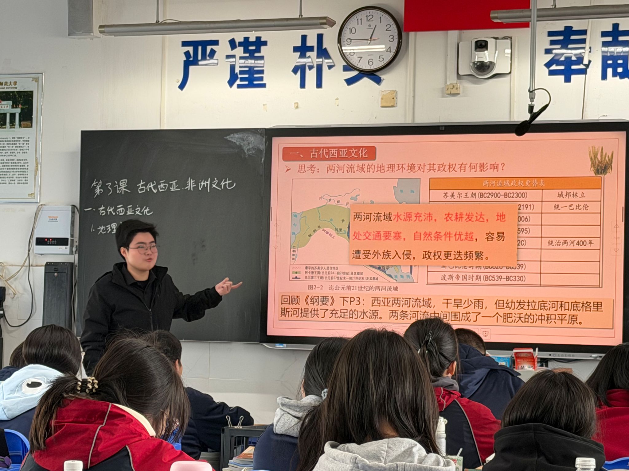 课堂上,何紫昕老师教态从容自然、授课逻辑清晰、语言流畅生动,注重师生互动引导。同学们思维活跃、踊跃发言,深度参与课堂探究,扎实掌握古代西亚、非洲文化核心知识,有效拓展历史视野,整堂课节奏把控得当,教学成果亮眼。